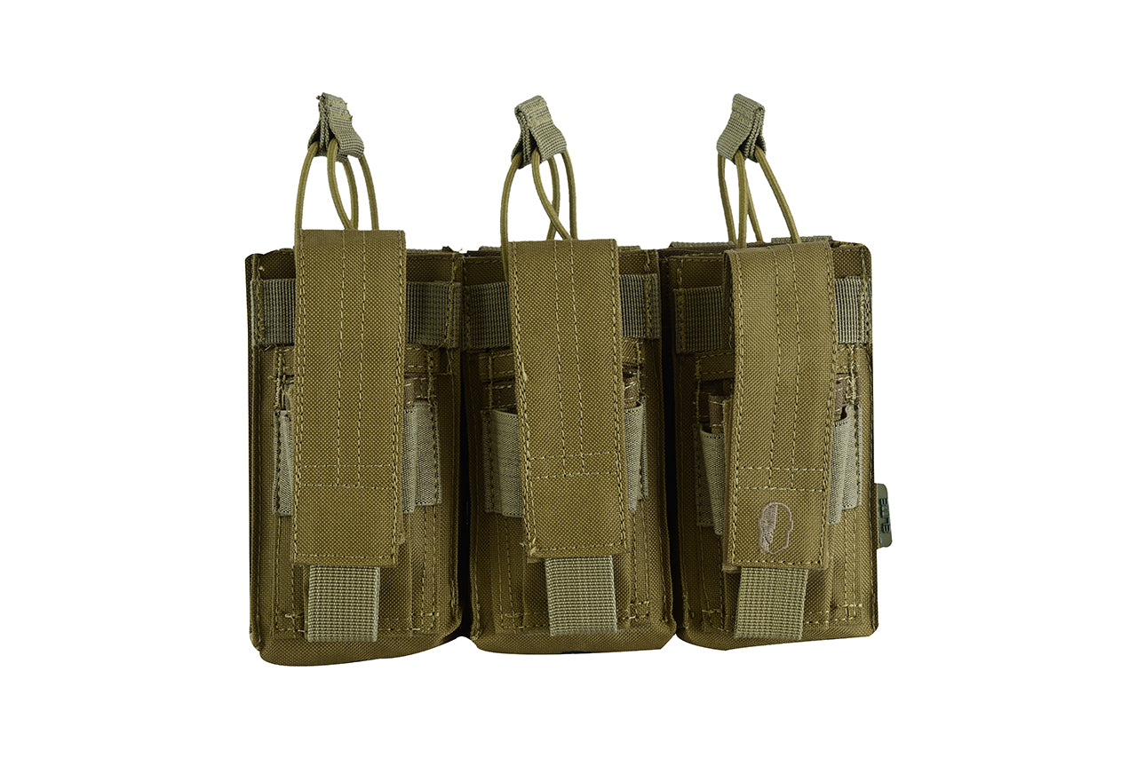 The Shadow Tactical triple .556/9mm open-top Mag Pouch combines and secures three M4 magazines with bungee straps and three 9mm magazine with adjustable velcro flaps. It’s engineered utilizing our 600 Denier PU*2 DWR coated Cordura which offers significant weight reduction. Since the entire pouch is adjustable, from the elastic pull-tab cords to the pistol mag flaps. This pouch is tough and tactical, with riveted holes at the bottom to allow for drainage. Mag placement is easy and retrieval is quick, as the tops of the pouch open rapidly for situations in which speed is paramount. Magazines sit securely in place, making this a reliable piece of duty gear.